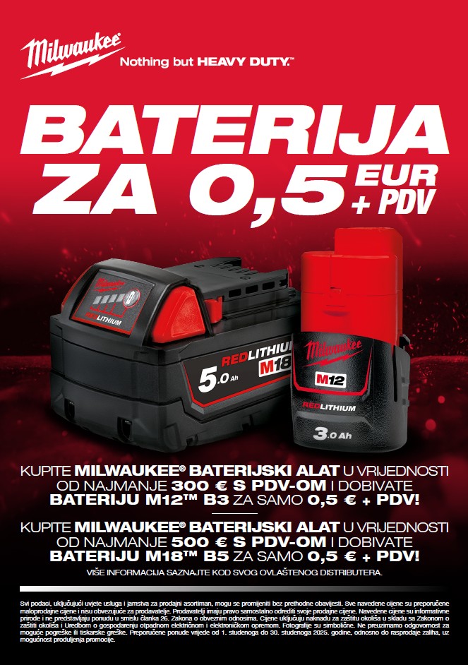 Kupite akumulatorski alat Milwaukee iz M18 platforme u vrijednosti 500 EUR s PDV-om i ostvarite pravo na M18 B5 za 0,50 EUR +PDV